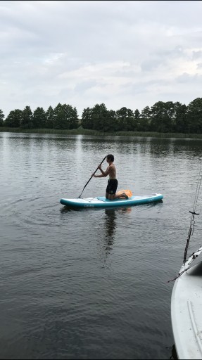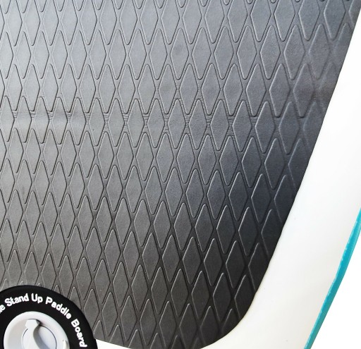 Дошка оснащена протиковзкою накладкою EVA з ромбоподібним малюнком, яка забезпечує дуже хороше зчеплення та запобігає ковзанню. Додатково у нас є повідець, який можна прикріпити до щиколотки, а іншою стороною до одного з кілець, щоб навіть зісковзнувши, ми не відходили від дошки.