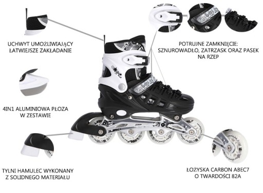 NH109 4в1 - це набір роликових, роликових і хокейних ковзанів в одному взутті. Завдяки змінним бігункам ми можемо перетворити роликові ковзани на ковзани для льоду або ролики. Регулювання розміру дозволяє взуття підходити під ногу користувача. Застібка, що складається з пряжки, липучки та шнурівки забезпечить комфорт і безпеку під час катання. NH109 виготовлені з високоякісних матеріалів, що гарантує довговічність протягом тривалого часу використання.