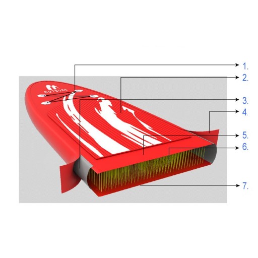 - Дошка виготовлена з армованого матеріалу за технологією drop stitch, що робить дошку надзвичайно жорсткою після накачування повітрям