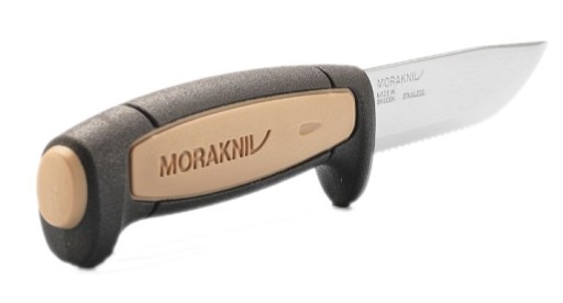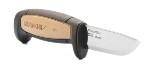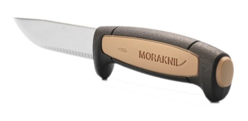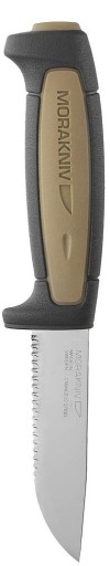 Лезо з профілем drop-point виготовлено зі шведської нержавіючої сталі Sandvik 12C27, загартованої до твердості 56-58HRC. Виготовляється в процесі гартування рідким азотом при температурі -80°, досягає твердості HRC 57-58 за шкалою Роквелла. Сталь Sandvik 12C27 містить 0,6% вуглецю і 13,5% хрому і характеризується високою міцністю і стійкістю до зовнішніх умов і іржі. Відповідне загартування забезпечує хорошу гостроту та легкий процес повторного заточування. Клинок виготовлявся із зубчастим нарізом. Зубчасте – зубчасте лезо, яке використовується в рятувальних ножах, вітрильних ножах і для використання на роботі. Крім того, рука захищає кожух від руху, що запобігає випадковому зісковзу руки на ріжучу кромку. Захист у вигляді хрестовини в певному сенсі налаштовує цей ніж на менш досвідчених користувачів. Більш досвідчені користувачі неодмінно оцінять невелику вагу та універсальність ножа. Яскраві кольори ручки є практичним рішенням, оскільки вони полегшують швидкий пошук ножа під час роботи в гаражі, саду чи таборі.