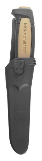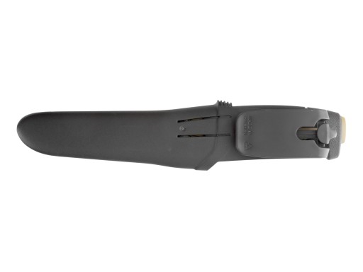 У комплект входить практичний пластиковий чохол чорного кольору. Завдяки особливій конструкції та дренажному отвору ви можете безпечно вставити в нього мокрий або сильно забруднений ніж. Швидке кріплення до пояса, краю кишені або краю брюк забезпечується гнучким затискачем. Піхви мають фіксатор, що запобігає випаданню ножа з піхов. Ще однією перевагою ROPE є система з’єднання ножів Mora. Таким чином, ми можемо носити 2-3 ножі і використовувати їх залежно від наших потреб. Сумісний з більшістю ножів Mory.