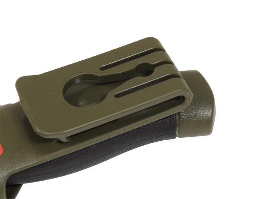 У комплект входить практичний пластиковий чохол темно-зеленого (оливкового) кольору. Завдяки особливій конструкції та дренажному отвору ви можете безпечно вставити в нього мокрий або сильно забруднений ніж. Швидке кріплення до пояса, краю кишені або краю штанів забезпечує пружинний затиск. На піхвах є фіксатор, що запобігає випаданню ножа з піхов.