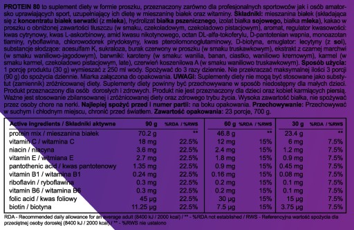 Склад: білкова суміш (концентрат сироваткового білка 43%, гідролізат пшеничного білка 43%, ізолят соєвого білка, молочний білок 14%), какао-порошок знежирений, ароматизатор, регулятор кислотності: лимонна кислота, L-аскорбінова кислота, нікотинамід, DL-альфа-токоферил ацетат, D-пантотенат кальцію, мононітрат тіаміну, рибофлавін, піридоксин гідрохлорид, D-біотин, птероїлмоноглутамінова кислота, ціанокобаламін, емульгатор: лецитин (соя без ГМО), підсолоджувачі: ацесульфам К і сукралоза, барвник: порошок червоного буряка (для смаку полуниці), бета-каротин (аромат ванілі, банана, печива), порошок карамелі (аромат карамелі, горіха шоколаду), екстракт чорної моркви (аромат ванілі та ягід).
