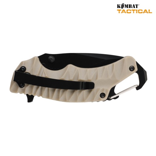 Ергономічна рукоятка на сталевому каркасі з кришками з пластику, стійкого до механічних пошкоджень, хімічних речовин і високих температур. Матеріал запобігає примерзанню рукавичок до ручок. Шліфування на підкладках забезпечує максимальне захоплення рукою та високий комфорт роботи. Ззаду на рукоятці є карабін з автоматичним замком, можна закріпити ніж на шлевці штанів або спорядження та прикріпити ключі. Карабін дозволяє прикріпити на зап'ясті петлю або повідець. Карабін також виконує функцію відкривачки для пляшок. Пояс і затиск для одягу, виготовлені з пружинної сталі. Ніж закручується гвинтами torx, розбирається для чищення та регулювання опору розтину.