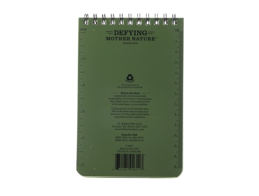 Блокноти Rite in the Rain вирішують проблему підмоклих і нерозбірливих конспектів. Запатентований, екологічний папір дозволяє зберігати та легко зчитувати інформацію під час зливи, хуртовини та під водою. Водонепроникні блокноти Rite in the Rain від американського бренду Rite in the Rain використовуються в усьому світі, від пустель до вологих тропічних лісів. Невеликий розмір, закруглені кути, тверда нейлонова обкладинка та суцільна сталева спіраль забезпечують зручність носіння та довговічність наших банкнот.