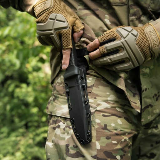 Рукоятка ножа виготовлена з Krey-Ex, а глибокі вирізи в ній покращують хват навіть брудною рукою. Конструкція ножа описується як повнорозмірна, що означає, що шпилька леза, вбудована в рукоятку, досягає кінця і є трохи вужчою за неї.