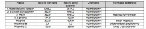 Містить активні речовини, які забезпечують правильну реконструкцію хрящової тканини і підтримують сполучну тканину в належному стані. Завдяки великій дозі він підтримує побудову сполучної тканини, зокрема суглобового хряща. Ключовим інгредієнтом продукту є колаген, який, як показують дослідження, зменшує відчуття болю та дискомфорту, зокрема. у людей з остеопорозом.