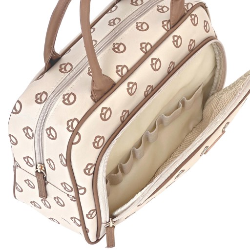 Дизайнерська косметичка бежевого кольору з золотими деталями з колекції Gold. Водяний знак і великий металевий логотип золотого кольору підкреслюють оригінальність продукту.