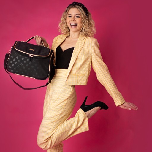 При розробці цієї моделі було продумано кожну деталь - дві блискавки, посилену ручку, плечовий ремінь і золотисті металеві пряжки для ременів. Золота обробка чудово гармонує з насиченим чорним матеріалом, з якого виготовлена косметичка.