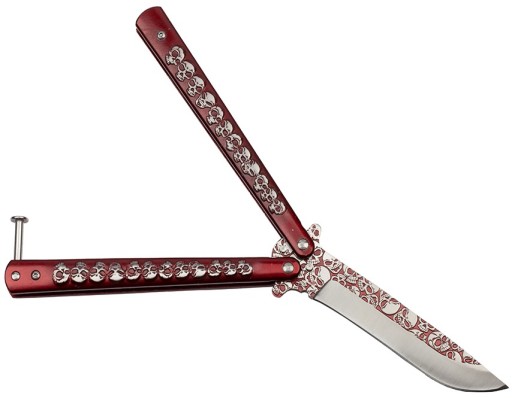 Металева ручка червоного металічного кольору має класичну форму для ножів-метеликів.
