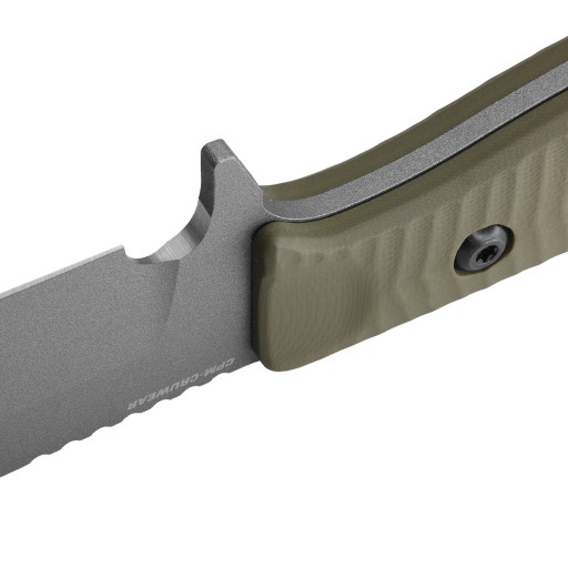 Для виготовлення леза використовувалася новітня інструментальна сталь Crucible Industries LLC - CPM-Cruwear, загартована до твердості 63-65 HRC. Завдяки відмінній зносостійкості та міцності, CPM-Cruwear можна назвати вдвічі кращим за оригінальну сталь D2. Нова формула збагачена добавками ванадію, вольфраму та молібдену, які надають сталі виняткової зносостійкості та забезпечують високу міцність. Вибираючи ніж з такої сталі, варто придбати алмазну точило, оскільки заточка за допомогою звичайного керамічного бруска може бути дуже трудомісткою і малоефективною.