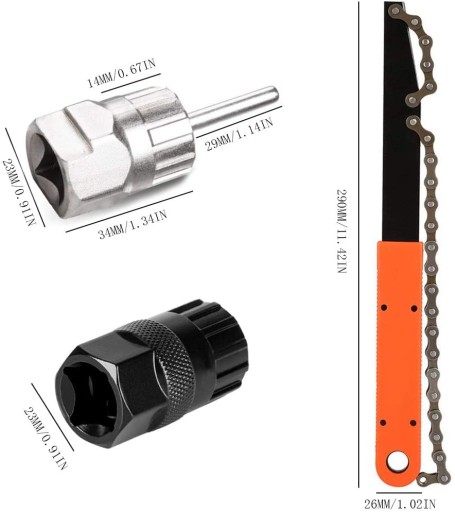 - Знімач касети, гвинтовий знімач обода: цей комбінований набір із гайковим ключем/кільцевим замком. Обидва компоненти мають високу якість, термічно оброблені, щоб уникнути провисання та згинання. Інструмент для зняття касети/стопорне кільце ротора підходить до стопорних кілець Shimano, SRAM, SunRace, SunTour, Chris King та інших. Також підходить до дискових гальмівних кілець Shimano, стабілізує інструмент.