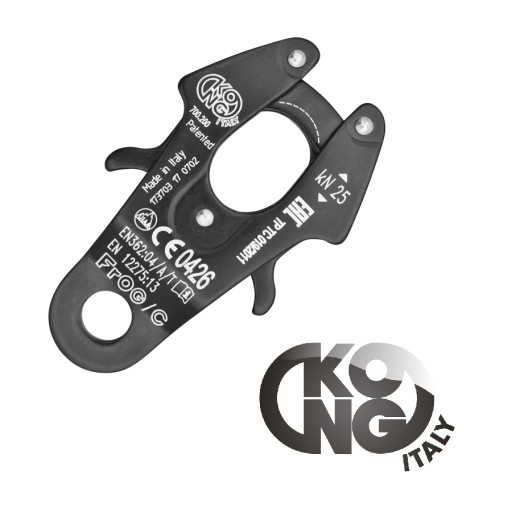 Карабін Kong Frog Cable - це запатентований італійським виробником роз'єм, який можна встановити інноваційним способом без необхідності «протягувати» через точку з'єднання. У відкритому положенні карабін має проріз шириною 12,7 мм, який можна насунути на місце кріплення. Спеціально розроблена система автоматично закриється, щоб запобігти розстібанню. Замок можна зняти одночасним натисканням на обидва кулачки карабіна, розташовані з боків.