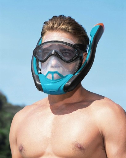 Маска покриває все обличчя і має 2 вбудованих трубки. Він розроблений із застібкою, яку легко регулювати. Чудовий силікон забезпечує комфортну, надійну посадку та здатність вирівнювати тиск під час занурення. Технологія подвійного потоку повітря дозволяє легко вдихати і видихати через ніс і рот, вдихаючи через одну трубку і видихаючи через іншу.
