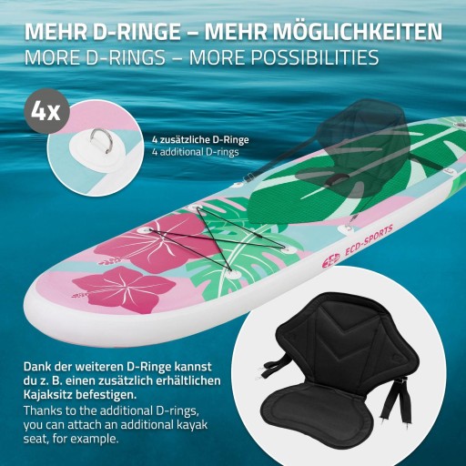 : Дошка ECD Germany Stand Up Paddle — це фантастична, універсальна дошка для людей вагою приблизно до 120 кг. Завдяки довжині 320 см наша дошка легко поміститься один дорослий і одна дитина. Дошка для веслування ідеально підходить для будь-якого рівня навичок, від початківців до просунутих. З допомогою? ви можете використовувати цю дошку для серфінгу на повну від морських красот. Оскільки? він надувний і його можна легко транспортувати у сумці для транспортування, що входить у комплект. Сумка для транспортування також може вмістити комплект аксесуарів, весло та насос. Сумка виготовлена з водонепроникного, міцного і зносостійкого матеріалу. Це означає, що ви також можете захистити? цінні речі та одяг проти вологи? і пісок. Дошка для весла товщиною 15 см виготовлена з PVC/EVA, що дозволяє їй витримувати великі навантаження та забезпечує оптимальну продуктивність у воді. Міцна конструкція та мала вага забезпечують Просте управління та швидке прискорення. Властивості: Збалансований розподіл обсягу Складна конструкція для зручності перенесення Для людей вагою приблизно до 120 кг довжина?? 320 см Додаткова ручка, вбудована в середину, забезпечує більш зручне перенесення Висока стабільність забезпечення стабільного поставити? при маневруванні або зміні напрямку 4 гумові D-кільця там? зробити це легше носіння додаткового обладнання 1 кільце? типу D для кріплення страхувального шнура, що входить у комплект У комплект входить транспортна сумка з набором аксесуарів Водонепроникна сумка для транспортування захищає від вологи, піску та бруду довжина?? алюмінієве весло регулюється в діапазоні від 166 см до 212 см. Односторонній підлоговий насос високого тиску з манометром - для швидкого та легкого накачування Діапазон поставки: 1x дошка для веслування стоячи 3x плавник 1x транспортний рюкзак 1x повітряний насос з манометром 1x ремонтний комплект 1x весло з 3 частин 1x страхувальна мотузка 1x посібник користувача Технічні дані: Матеріал: падлборд з ПВХ, протиковзке покриття з EVA Основний колір: м'ятно-рожевий Розміри (ДxШxВ): приблизно 320 x 80 x 15 см Справа? Весла: Алюміній / ПВХ довжина?? весла: приблизно 166 - 212 см Максимальна вантажопідйомність: приблизно до 120 кг Максимальне розміщення: 1 дорослий і 1 дитина / 2 дітей Максимальний тиск повітря: 12 psi / 0,8 бар Вага (без весла): приблизно 9,6 кг