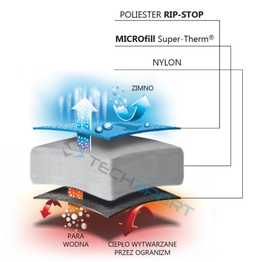 - шар із зовнішнього боку - RIP-STOP POLYESTER - матеріал, який пропускає водяну пару і не пропускає холод і вологу, з характерною опуклою сіткою (посилена додаванням додаткового, більш міцного волокна через рівні проміжки часу. Це запобігає розриву матеріалу) .