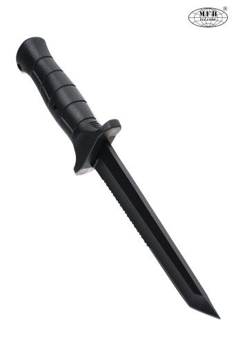 Репліка бойового ножа німецької армії (Бундесвер). Виготовлені відповідно до оригіналу, виробник вказує, що це не оригінал, тому що їх важко відрізнити. Створено професіоналами та для професіоналів, німецька надійність і турбота. Ніж KM2000 універсальний у бою, виживанні та повсякденному житті. Призначений для спецпідрозділів армії та поліції. Лезо TANTO виготовлене з нержавіючої сталі 440A, дуже міцне, товщиною 4,2 мм. Лезо COMBO, частково зубчасте, забезпечує точне різання та брутальне розпилювання чи розривання. Гладке лезо, заточене під особливим кутом, що гарантує гостроту і стійкість до затуплення. Зубці полегшують різання пластмаси, дерева, канатів і текстилю, виявляють підвищену стійкість до затуплення. Окислення зменшує відбиття світла та додатково захищає від корозії. Гострий кінчик і форма леза надають цьому ножу високу колючу здатність. Ніж від клинка до обуха (на всю довжину) є одним цілим, що робить його надзвичайно міцним. Ергономічна композитна рукоятка, стійка до механічних пошкоджень, хімічних речовин і екстремальних температур, не проводить струм, матеріал схожий на Zytel. Профільована анатомічна рукоятка забезпечує гарне захоплення, надзвичайно надійний хват і високий комфорт роботи. Повна ручка, оснащена двосторонньою хрестовиною, що запобігає ковзанню руки по клинку, верхня хрестовина з перфорацією для великого пальця. Кінець рукоятки оснащений важкою головкою, якою можна наносити удари. На задній частині ручки є вушко для кріплення петлі або повідця. Композитно-нейлонові піхви, оснащені точилом, закріплені на нейлоновому носії (типу жаби). Невід'ємною частиною спорядження може бути піхва в модульній системі 25 мм. Модульна система, сумісна з MOLLE, дозволяє встановлювати на жилети, рюкзаки або панелі. Нейлонова сумка, яку можна носити на поясі, закріпити на стегні, литці або передпліччі. Самі композитні піхви можна носити в спеціальних кишенях для ножів. Подвійний захист від випадання ножа, нейлонова стрічка з застібкою і пружиною, що притискає ніж всередині піхв. В комплекті оригінальна коробка та шнур для кріплення.