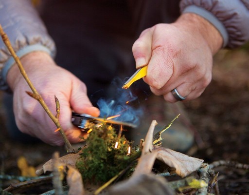- Аксесуари для виживання, прикріплені до інструменту, витягнуті назовні: запалювач, рятувальний свисток і алмазна точилка,