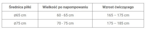 М'яч для фітнесу 65см Umbro | відповідний розмір м'яча вибирається в першу чергу на основі росту людини, що займається. Таблиця нижче описує залежність діаметра м'яча від росту людини, що займається.
