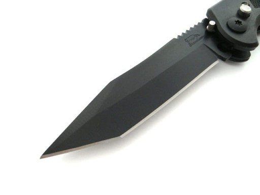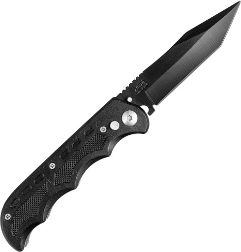 Класичний, чорний автоматичний ніж має лезо з оригінальним профілем танто з високоякісної нержавіючої сталі №420.