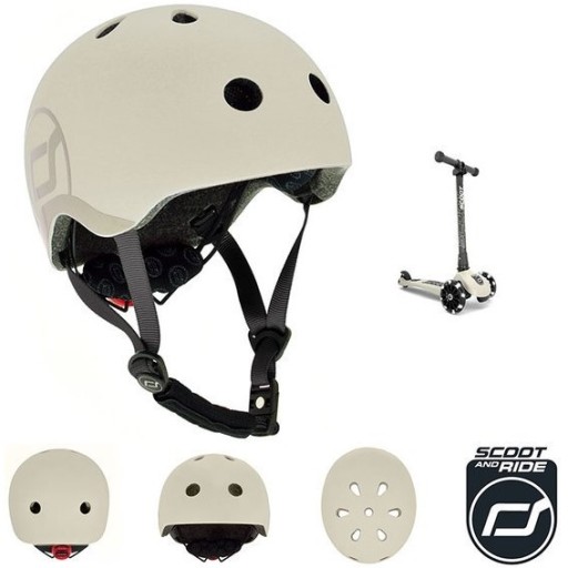 - колір шолома відповідає пастельній колекції Highwaykick - корпус кремово-сірий (попелястий), тому що боки на тон темніші з графікою з логотипом Scoot&Ride, ремені регулювання - темно-сірі, відповідає стандартам: CE, EN1078