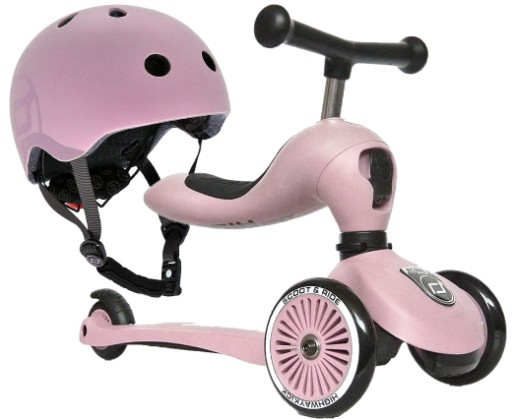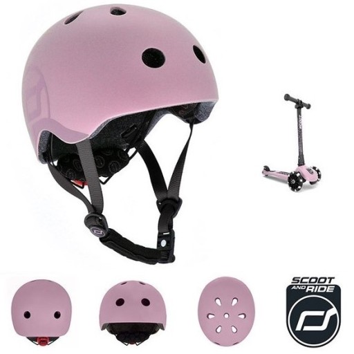 - колір шолома відповідає пастельній колекції Highwaykick - корпус світло-рожевий (Rose), тому що боки на тон темніші з малюнком з логотипом Scoot&Ride, ремінці для регулювання - темно-сірі