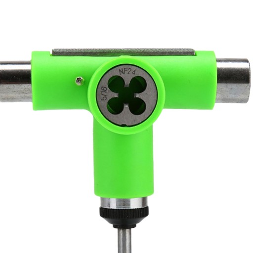 Інструмент T-Skateboard Tool включає 3 різні розміри гнізд (3/8", 1/2", 9/16") і висувну хрестоподібну викрутку, яка вставляється у верхню частину ручки, коли не використовується