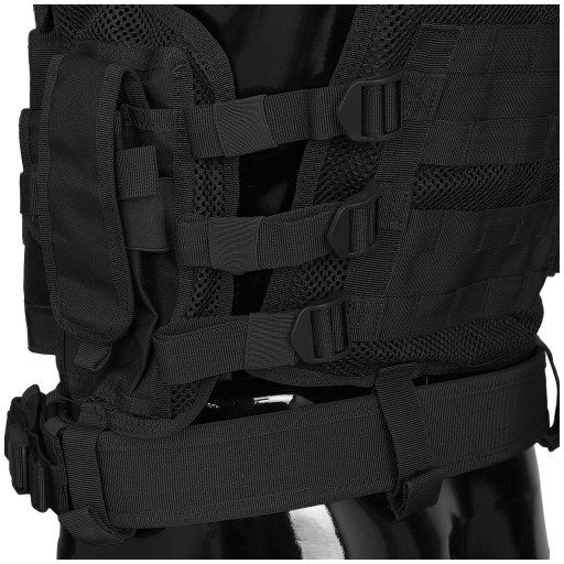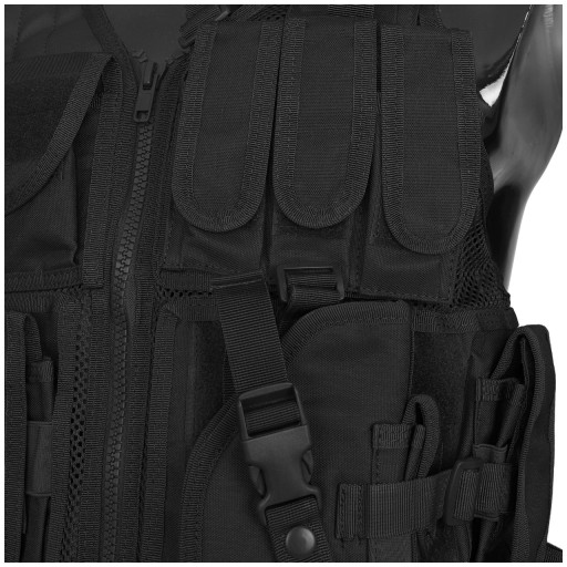 Тактичний жилет розділений на дві частини і застібається на блискавку. Права сторона оснащена кишенею з органайзером і липучкою для нашивок і трьома сумками стандарту STANAG. Надплечовий ремінь оснащений протиковзким затильником. З лівого боку розташовані чотири універсальних підсумки для магазинів, кобура для кожної моделі пістолета з підсумком під магазин і один стандартний підсумок STANAG. Кобура знімна. Всі мішечки застібаються на липучку.