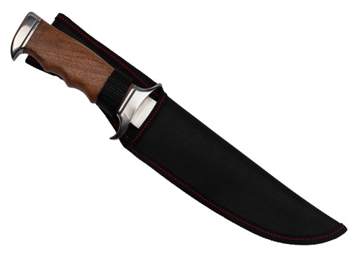 Мисливський ніж має чорні класичні піхви, які можна закріпити на брючному поясі завдяки шлевці.