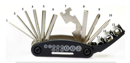 - Багаторозмірний ріжковий ключ (3 розміри + спицевий ключ)