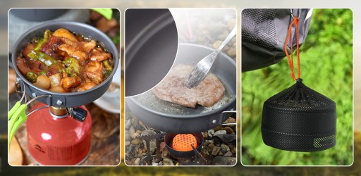 У комплект поставки входить: 1 × чайник + 1 × сковорода + 1 × каструля + 2 × чашки + 1 × ложка, виделка та ніж + 1 × сумка з тканини Oxford