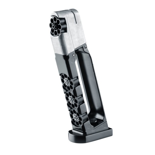 - Оснащений магазином для капсули CO2 і 4 кільцевими вставками для кульок, в тому числі одна заряджена ємністю 8 шт.