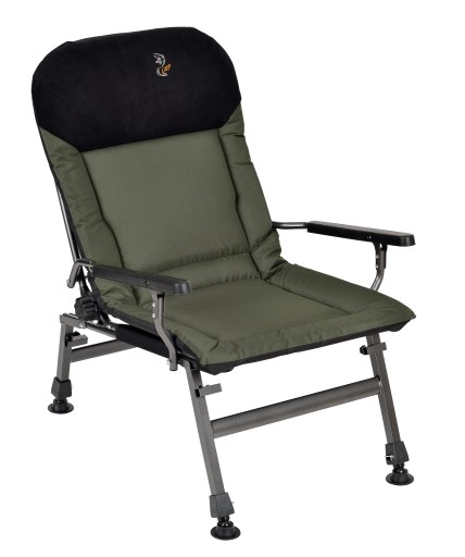 Крісло також оснащене системою кріплення підніжок, дуже зручними підлокітниками, покритими міцним, приємним на дотик поролоном. Матрац, як і в інших моделях, виготовлений з якісного водонепроникного матеріалу, але додатково отримав зручний підголівник, потовщений поролоном, обробленим чорним приємним на дотик флісом. Усі ці зміни та переваги створюють ідеальне крісло для тривалої риболовлі.