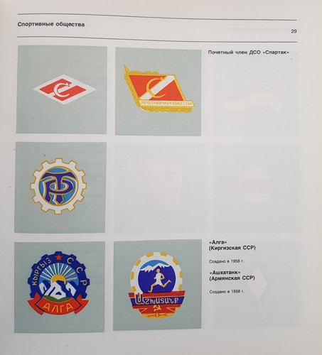 : Альбом, в якому представлені емблеми, символи, прапори, значки і медалі всіх спортивних товариств Радянського Союзу, а також значки і емблеми міжнародних спортивних федерацій і асоціацій з їх описом. Видання для істориків спорту та всіх уболівальників. Тексти написані російською мовою.