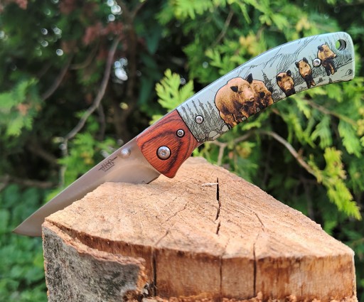 ✅ Ніж має двокомпонентне покриття з дерева та анодованого авіаційного алюмінію, яке вкрите декоративною мисливською графікою з парою мотивів оленів.