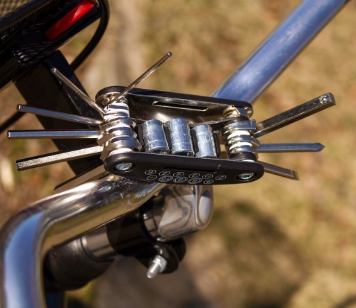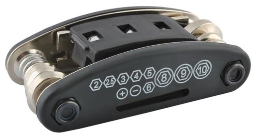 У складеному вигляді він поміщається в руці і його легко зберігати, наприклад, у кишені або в сумці для велосипеда. У набір входять: шестигранні ключі, викрутки, розетки з перехідником, ріжкові ключі та спеціальний ключ для спиць.