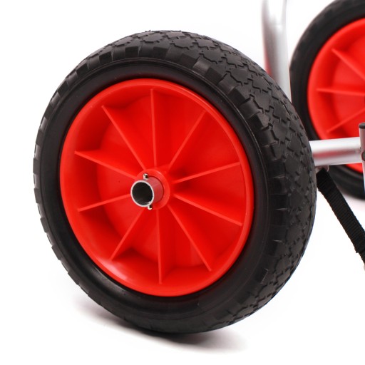 - Алюмінієві опори, дуже міцні та довговічні. Довгий кріпильний ремінь допомагає міцно закріпити каяк на візку, якщо каяк впаде з візка.