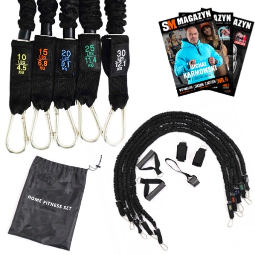 Набір із п'яти резистентних ремінців, призначених для занять вдома. Вироби відрізняються відмінною міцністю. Вони є відмінним вибором для людей, які не можуть користуватися тренажерами.