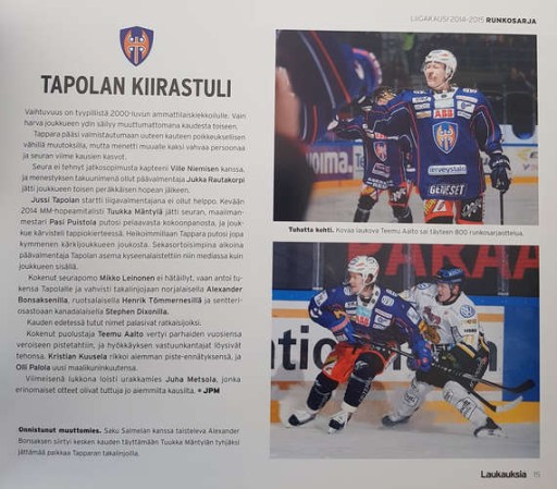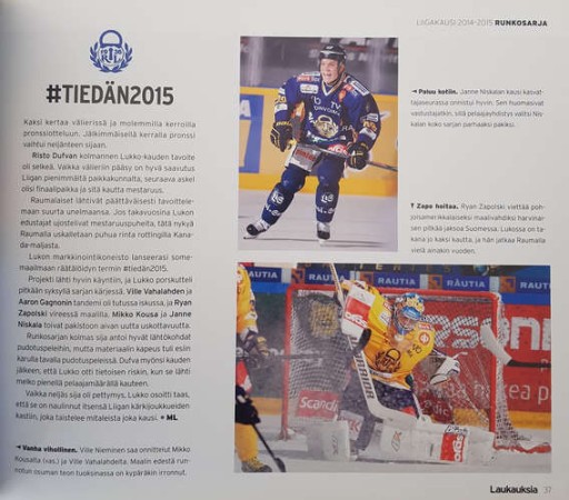 : Фотографічний підсумок сезону 2014/2015 у Лізі, найвищому рівні хокею у Фінляндії, який завершився перемогою команди Kärpät, яка перемогла у фінальному матчі команду Tappara 4:3. Фотограф Юкка Раутіо був присутній зі своєю камерою на більшості найважливіших подій і матчів - альбом складається з його барвистих фотографій з текстом, підготовленим двома місцевими спортивними журналістами: Марко Леппанен і JP Mikola. Книга написана фінською мовою.