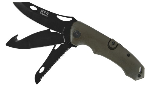 - 3 типи лез: гладкі, зубчасті для пиляння та гачкові для розрізання мотузок