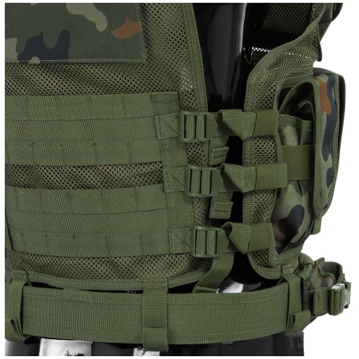 Тактичний жилет розділений на дві частини і застібається на блискавку. Права сторона оснащена кишенею з органайзером і липучкою для нашивок і 3 пакетів STANAG. Плечовий ремінь над плечем оснащений протиковзким затильником. З лівого боку розташовані чотири універсальних підсумки для магазинів, кобура для кожної моделі пістолета з підсумком під магазин і один стандартний підсумок STANAG. Кобура знімна. Всі мішечки застібаються на липучку.