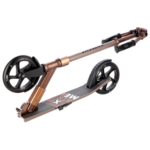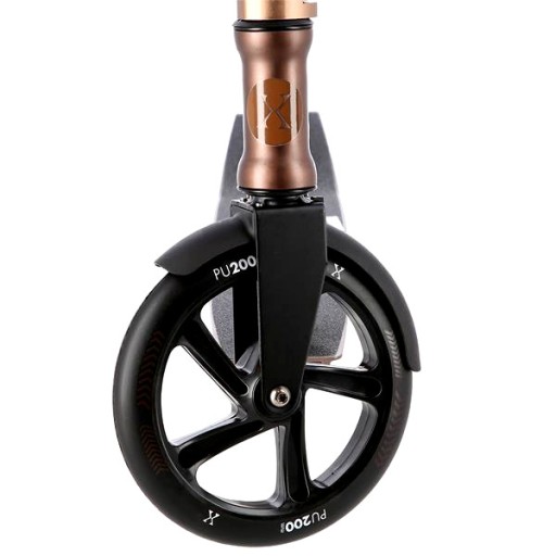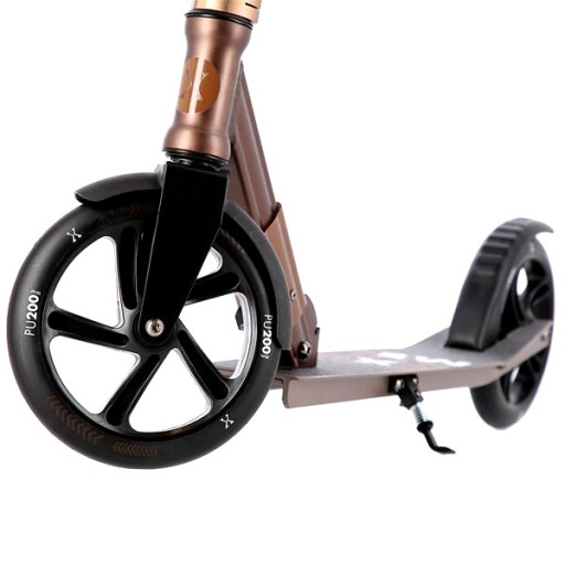 HM205, має два великих колеса розміром 200 мм. Це дозволяє ефективно маневрувати самокатом і долати нерівності. Підшипники класу ABEC9 підвищують стабільність і плавність водіння, а заднє ножне гальмо забезпечує безпеку.