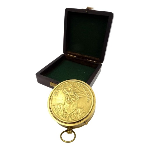 Запрошую придбати вражаючий компас із сонячним годинником. Повністю виготовлений з латуні. Міцно зроблений. Скло скло. Компас має замок. На обкладинці — зображення португальського дослідника шляху до Індії Васко да Гами. Струнковий гном (елемент, що відкидає тінь)