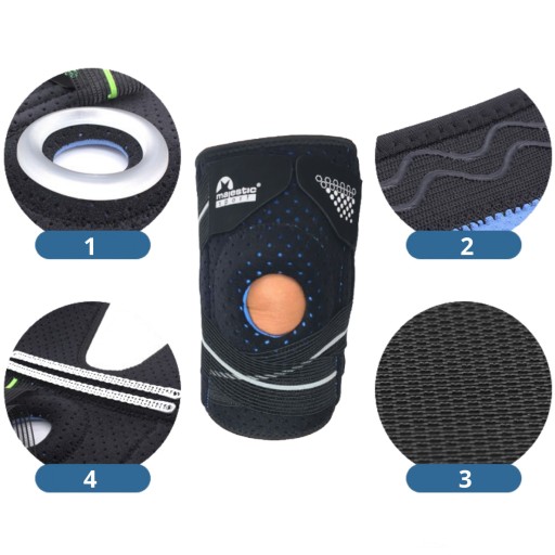 ❗Стабілізатор застібається на дві широкі липучки, завдяки чому можна регулювати окружність і ступінь натискання. Спеціальна відкрита конструкція та два еластичних ремені забезпечують належну підтримку колінної чашечки. Крім того, уздовж бандажа вшиті чотири стабілізуючі пружини, які перешкоджають бічному повороту коліна. Стабілізатор Majestic Sport підходить як для правого, так і для лівого коліна.