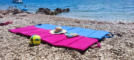 Пляжний килимок виготовлений з водонепроникної тканини з двох сторін, всередині поролон висотою 3 см, завдяки чому ми не відчуваємо ніякого дискомфорту на кам'янистих пляжах. Це було перевірено нами особисто на балканських пляжах, а також багатьма нашими задоволеними клієнтами, про що свідчать їхні позитивні відгуки та фотографії.