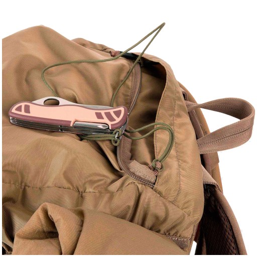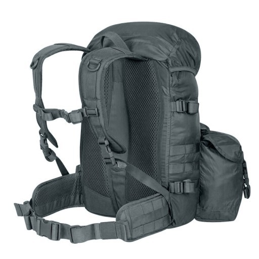 Кожна зовнішня кишеня, окрім клапана з пряжкою, має власний димохід, який при витягуванні захищає вміст від втрати. Кишені вшиті. Завдяки цьому він може носити за ними, наприклад, сокиру. В основному клапані є дві великі кишені для зручностей. Кишеня з внутрішньої сторони клапана сітчаста, закривається на блискавку. Клапан закривається на дві пряжки. Додаткові кишені в системі MOLLE/PALS можна прикріпити до рюкзака в декількох різних місцях; з боків, спереду та посередині на спеціальній панелі. З боків рюкзака вшиті дві компресійні лямки, на які також можна прикріпити, наприклад, спальний килимок. На дні рюкзака є стрічки, які також можна використовувати для цієї мети. Щоб зменшити вагу конструкції, ми використали поєднання матеріалу Cordura® 500D з нейлоном 210D. Ця комбінація також гарантує міцність у ключових місцях. Система перенесення заснована на пластиковій жорсткій спинці з дихаючими сітчастими накладками та анатомічно профільованими плечовими лямками. У комплект входить відстібний широкий пояс з осередками PALS.