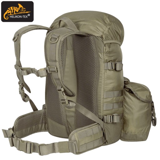Кожна зовнішня кишеня, окрім клапана з пряжкою, має власний димохід, який при витягуванні захищає вміст від втрати. Кишені вшиті. Завдяки цьому він може носити за ними, наприклад, сокиру. В основному клапані є дві великі кишені для зручностей. Кишеня з внутрішньої сторони клапана сітчаста, закривається на блискавку. Клапан закривається на дві пряжки. Додаткові кишені в системі MOLLE/PALS можна прикріпити до рюкзака в декількох різних місцях; з боків, спереду та посередині на спеціальній панелі. З боків рюкзака вшиті дві компресійні лямки, на які також можна прикріпити, наприклад, спальний килимок. На дні рюкзака є стрічки, які також можна використовувати для цієї мети. Щоб зменшити вагу конструкції, ми використали поєднання матеріалу Cordura® 500D з нейлоном 210D. Ця комбінація також гарантує міцність у ключових місцях. Система перенесення заснована на пластиковій жорсткій спинці з дихаючими сітчастими накладками та анатомічно профільованими плечовими лямками. У комплект входить відстібний широкий пояс з осередками PALS.