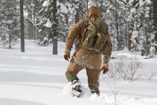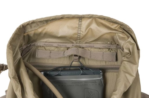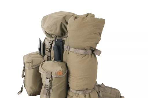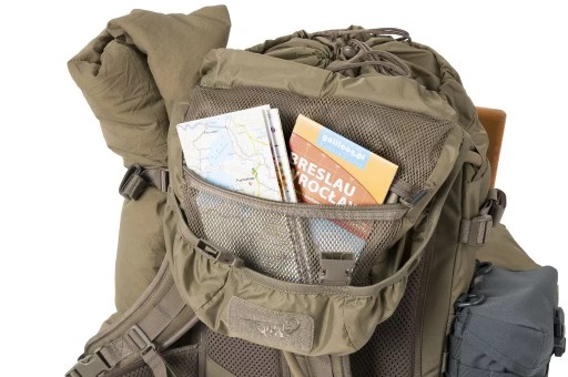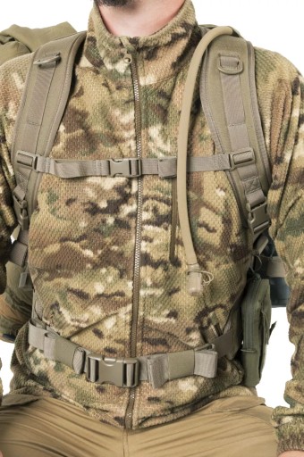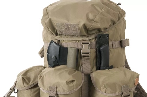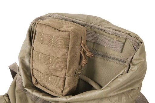 Кожна зовнішня кишеня, окрім клапана з пряжкою, має власний димохід, який при витягуванні захищає вміст від втрати. Кишені вшиті. Завдяки цьому він може носити за ними, наприклад, сокиру. В основному клапані є дві великі кишені для зручностей. Кишеня з внутрішньої сторони клапана сітчаста, закривається на блискавку. Клапан закривається на дві пряжки. Додаткові кишені в системі MOLLE/PALS можна прикріпити до рюкзака в декількох різних місцях; з боків, спереду та посередині на спеціальній панелі. З боків рюкзака вшиті дві компресійні лямки, на які також можна прикріпити, наприклад, спальний килимок. На дні рюкзака є стрічки, які також можна використовувати для цієї мети. Щоб зменшити вагу конструкції, ми використали поєднання матеріалу Cordura® 500D з нейлоном 210D. Ця комбінація також гарантує міцність у ключових місцях. Система перенесення заснована на пластиковій жорсткій спинці з дихаючими сітчастими накладками та анатомічно профільованими плечовими лямками. У комплект входить відстібний широкий пояс з осередками PALS.