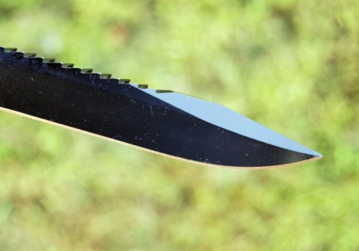 - з профілем Clip-Point і товщиною 5 мм, виготовлений з міцної пружинної сталі SAE 1095 (вуглецевої сталі), загартованої до 55 HRC.