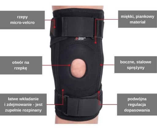 По обидва боки брекета вшиті гнучкі пружини плоского профілю. Вони розміщені в тунелях. Вони збільшують латерально-медіальну стабілізацію колінного суглоба. Корсет, який носить відповідно до вказівок лікаря або фізіотерапевта, сприятиме одужанню. Забезпечить оптимальну підтримку під час діяльності.
